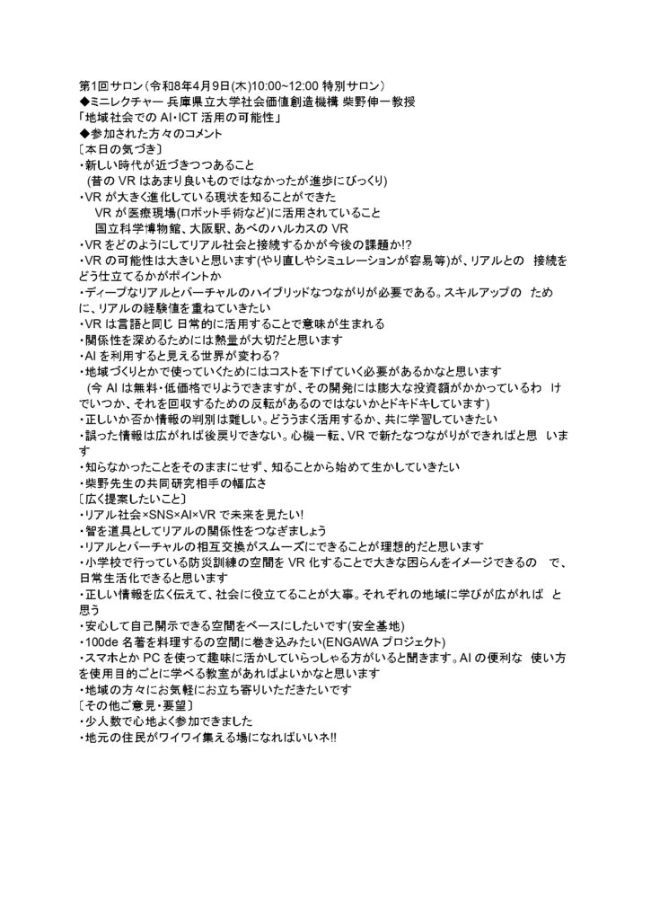 - 「ハート」のある技術: 単なるハードウェアの導入ではなく、地域の知恵を集約し、人と人の**「対話や偶然の出会い」**を促進するための道具としてVRを活用すべきだという「心の通った活用」が強調されました。